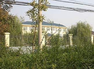 米色小樓西側(cè)有池塘,塘內(nèi)有幾只鴨在游泳。池塘的西邊有個(gè)大場(chǎng)院,上有兩層小樓一座,樓門緊鎖。米色小樓東隔墻,一個(gè)掛牌“亞偉飼料”的工廠已停產(chǎn)。院內(nèi)除有一位整理荒草的老者外,并無(wú)旁人。大門落鎖。