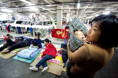 記者發(fā)現(xiàn),停滿車輛的地下車庫一層,有近三分之一都是來自外地的私家車或出租車,有些私家車主則直接睡在車?yán)铩?/p>