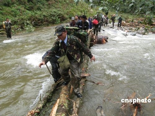 圖為救援人員穿越哀牢山原始森林無人區(qū)。途中多處河流需淌水而過,河水冰冷刺骨。中新社發(fā) 劉子倩 攝