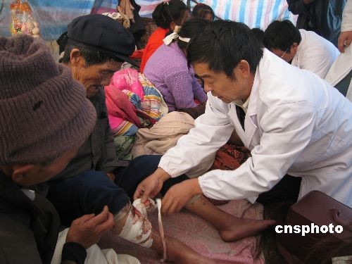 圖為十一月六日,楚雄市醫(yī)院副院長杜國才正在安置點為一位骨折災(zāi)民包扎傷口,因醫(yī)療條件有限,目前只能做緊急處理。