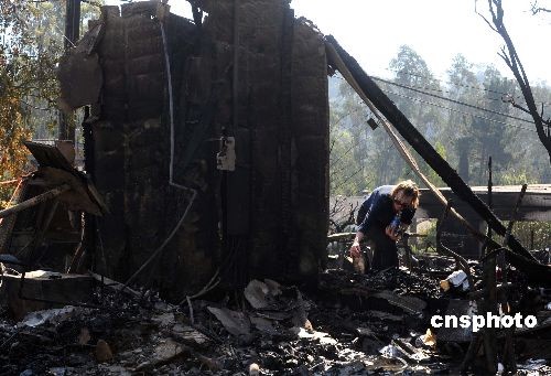 圖為消防員在蒙特塞托市一處被焚毀的房屋廢墟上防止死灰復(fù)燃。