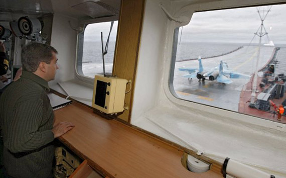 俄總統(tǒng)梅德韋杰夫在庫茲涅佐夫號(hào)航母上觀看穩(wěn)定2008軍演(資料圖)