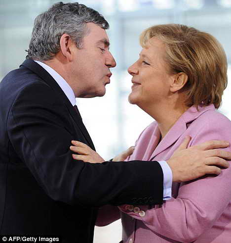 據英國《每日郵報》報道,英國首相布朗在親吻德國女總理默克爾的面部時顯得笨手笨腳,動作僵硬,他竟然誤撞在默克爾的鼻子上。