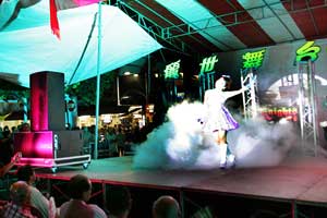七月歌臺的燈光璀璨奪目,一身閃耀裝扮的歌手落力地勁歌熱舞,臺下觀眾有些閑坐在椅子上觀賞,更多是站在一旁湊熱鬧聽歌的。只見有個身影穿梭在喧鬧的人群中,手持著半專業(yè)型相機正在專心攝影,為歷史留下紀錄。