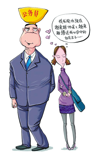 “嫁個公務(wù)員,就像買了一只潛力股。沒漲的時候,收入穩(wěn)定,有福利保障,一旦升遷,隨著職場地位的提高,帶來的精神和物質(zhì)上的附加值是不可估量的!贝髮W(xué)畢業(yè)3年,在一家設(shè)計公司任職的黃露是一名資深“嫁碗族”,在她馬不停蹄的相親路上,對公務(wù)員總是大開綠燈,“一聽說是公務(wù)員,好感會直線上升!
