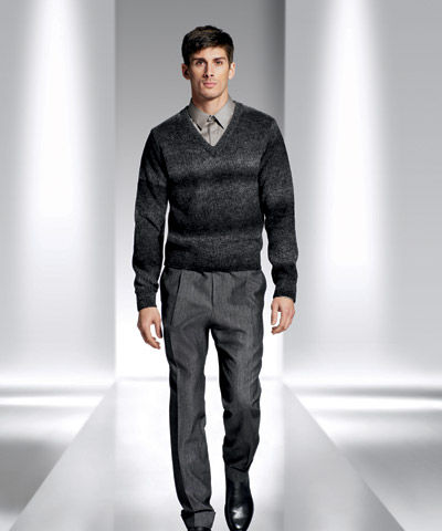 服裝的整體線條幾乎全都著墨于窄版、短身、合腰。而暗面布料如法蘭絨、羔羊毛、英國雪特蘭短羊毛、軋別丁斜紋防水布及粗氈羊毛,與亮面科技材質如尼龍、絲、緞相互搭配,展現出強烈的視覺對比,富有華麗的時尚輪廓。色彩運用最受男士們歡迎的黑、灰、深藍、橄欖綠及咖啡色為基調,點綴以亮紅、軍綠色,再度以反差色系突顯搶眼的風格;而金屬材質適時加入,更具畫龍點睛的效果。