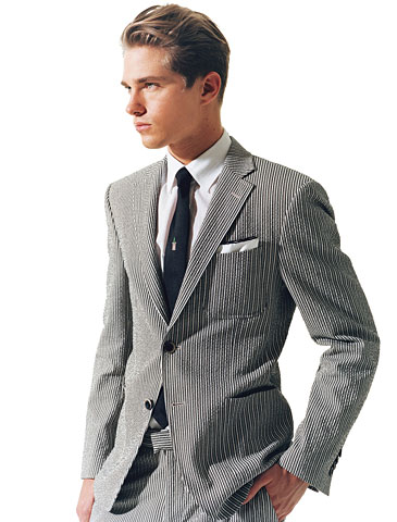 七:條紋外套?肯定!再發(fā)愁你的條紋西裝沒法穿么?的確,如今大概只有四歲的孩子和沒有時尚品味的人才會選擇那種淺色的泡泡紗外套來作為自己的“出場”服裝。但是,告訴你個方法,只要簡單的加上黑色和白色的話,這款搭配就變得相當?shù)挠行汀⒊墒炝。搭配白色的襯衫,黑色的領帶,和一塊口袋方巾,那么無論是日常的辦公或者是小型的PARTY聚會,就都很合適了。