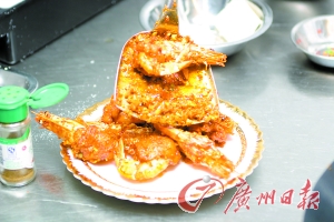 4. 在“翅蝦”上加上黃飛紅香脆椒適量、孜然粉少許、胡椒和鹽少許略為拌炒即起鍋。