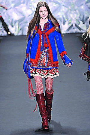 不愿意把沉悶帶進秋冬的設(shè)計師大有人在。彩虹般的印花圖案、鮮活的色彩組合還有新藝術(shù)式的刺繡,更別提軋花皮革的靴子、天鵝絨花朵的頭飾、串珠項鏈和佩里斯紋緊身衣……今年秋冬的設(shè)計Anna Sui相對其歷次的發(fā)布,算是最華麗繁復(fù)的。對于Anna Sui粉絲來說,這種將具有不同歷史性的藝術(shù)風(fēng)格大膽混融的手法,相較于前幾季,則顯得較孤芳自賞,像是如虹光般的印花、或是熱情活潑的配色處理,以及一些刺繡花紋和手工雕刻過的靴款、天鵝絨印花帽飾、串珠項鏈、迷幻的渦紋花呢緊身上衣…等等,盡管花俏,卻也成為Anna Sui2008秋冬系列的一大特色。