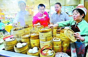 在陶陶居二樓,各式點心已經(jīng)一字排開,蝦餃、燒賣、叉燒包、腸粉、奶黃包、菠蘿包、蘿卜糕、粉果、榴蓮酥……“炸包沒有了!”開門不過十分鐘的時間,一名老伯正想要拿一份炸包,卻被告知已經(jīng)搶購一空。
