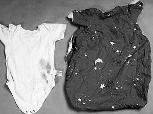 法庭展示的Baby P曾經(jīng)穿過的衣服,上面沾滿血跡。