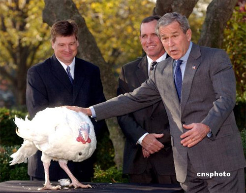 美國一年一度的感恩節(jié),美國總統(tǒng)布什特別依照慣例,在白宮赦免了2只火雞,溫馨又有趣。去年總共有2只火雞得到總統(tǒng)的免死金牌,分別叫“May”和“Flower”,也就是07年清教徒來到新大陸所搭乘的“五月花號”的意思。