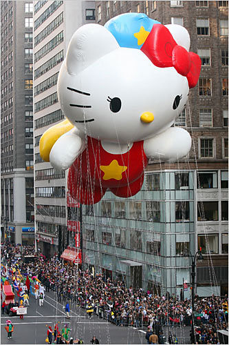 洛杉磯的小姑娘打扮成花季天使,和父母親一起參加十一月下旬的感恩節(jié)歡慶活動(dòng)。感恩節(jié)連日長(zhǎng)假,是每年美國(guó)人最重要的娛樂(lè)購(gòu)物節(jié)慶之一。07年美國(guó)紐約在當(dāng)?shù)貢r(shí)間22日舉行了感恩節(jié)大游行,萬(wàn)人參加場(chǎng)面熱烈。巨型卡通造型的氣球吸引了很多人。總共有11個(gè)大氣球加入游行,其中包括在天上飄的凱蒂貓,吸引現(xiàn)場(chǎng)所有人的目光,多達(dá)800名小丑和11支樂(lè)隊(duì),以及2000名拉拉隊(duì)員和舞者,將整個(gè)游行氣氛推向高潮。 一位紐約市民幽默的說(shuō):“我喜歡的是最后會(huì)出現(xiàn)的耶誕老人,因?yàn)檫@樣我們可以趕快離開(kāi),然后回家開(kāi)始吃火雞!”