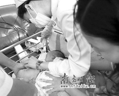 今年9月5日,化州市笪橋鎮(zhèn)一婦女產(chǎn)下一對連體女嬰。9月8日,連體女嬰被送到深圳市兒童醫(yī)院檢查治療。經(jīng)醫(yī)院檢查發(fā)現(xiàn),連體姐妹各自擁有一個肝臟,只是兩個肝臟連在一起,分離手術(shù)的成功率很大。院方?jīng)Q定前日上午9時進行手術(shù)。