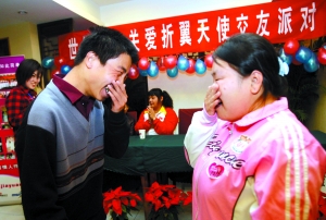 “如果感到幸福你就拍拍手。”31歲的盲人鋼琴調(diào)音師小陸羞澀地伸出手,與聾啞小伙郭川的手輕輕地握在一起。昨日,50余位殘疾人在勞動人民文化宮,集體相親。被稱為“袖珍公主”的吳小莉也前來相親。最后,她將寫著個人信息的紙條交給身高1.7米的陳先生。