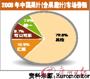 據(jù)國際研究公司Euromonitor給本報提供的統(tǒng)計,去年中國果汁(含果蔬汁)市場份額中,統(tǒng)一排名僅次于匯源和可口可樂,以7.2%名列第三位。