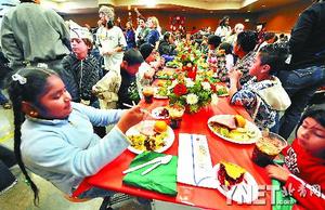 12月24日,圣誕節(jié)前夕,在美國(guó)加利福尼亞州洛杉磯市一慈善機(jī)構(gòu)內(nèi),數(shù)千名兒童享用著該機(jī)構(gòu)提供的圣誕大餐