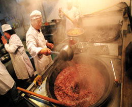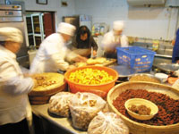 昨晚7時(shí),記者來(lái)到廣化寺時(shí),廚房里十多位義工已經(jīng)忙得不可開(kāi)交。據(jù)一位義工介紹,兩天前他們就開(kāi)始為熬臘八粥做準(zhǔn)備,挑米、挑豆子,清洗原材料,一直忙到昨天下午,才將上千斤原料拾掇干凈。