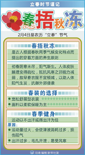 專家提醒說,立春時節(jié)乍暖還寒,公眾著裝要謹(jǐn)記“春捂秋凍”,慎防感冒。專家同時建議,春季健身時以不出汗或微出汗為佳。若運動量過大,則會使津液消耗過多,損傷陽氣。另外出汗過多,易受風(fēng)寒。(吳艷 吳潔瑾 俞立嚴(yán))