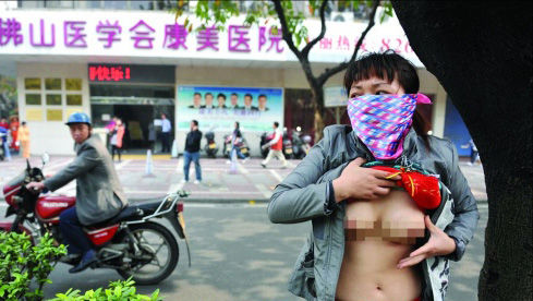 7日上午,趙女士站在廣東省佛山市康美醫(yī)院前的綠化帶中,身披條幅,敲擊銅鈸,一度撩起上衣,露出變形的雙乳,引來大批人群。趙女士稱3個(gè)多月前于康美醫(yī)院隆乳,術(shù)后雙乳變形,欲索賠8萬余元?得泪t(yī)院則稱手術(shù)不理想是她個(gè)人體質(zhì)所致。