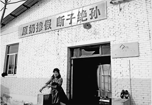 涇陽縣多家奶廠,近日都貼出同樣內(nèi)容的一條雷人標語:“原奶摻假,斷子絕孫”。涇陽縣蔣路鄉(xiāng)澳西牧場63歲的飼養(yǎng)員董學(xué)文說,看到這個標語就不舒服。張貼標語的公司希望各方面汲取三聚氰胺事件的教訓(xùn),標語的目的在于警示,也表明企業(yè)抓質(zhì)量的態(tài)度。牧場總經(jīng)理梁軍表示,他能理解公司這么做的初衷,但內(nèi)容值得商榷。(魏光敬 謝勇強攝影報道)