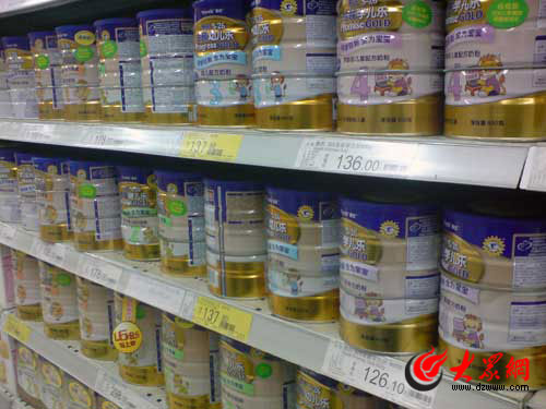 24日上午,記者在大潤發(fā)歷下店和濟(jì)南銀座商城的奶粉柜臺看到,惠氏奶粉仍然擺在貨架上,價格也未發(fā) 生變化;而在家樂福超市,記者看到惠氏奶粉已經(jīng)被擺上了促銷柜臺的顯著位置,記者注意到,惠氏2段S26金 裝健兒樂900克聽裝奶粉當(dāng)天售價仍然是178元,而惠氏3段S26金裝健兒樂900克聽裝奶粉售價已從155.8元直降 到137.8元,降幅達(dá)到18元。銷售人員告訴記者,惠氏被曝光的事她已經(jīng)知道,但并未接到下架通知,盡管她表示惠氏降價與“結(jié)石門”無關(guān),但記者從價格標(biāo)簽上看到,降價銷售的標(biāo)簽是24日當(dāng)天新?lián)Q的;在沃爾瑪超市,記者看到惠氏同樣在降價促銷,降幅與家樂福相同。