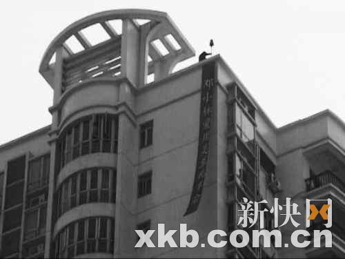 他背后的外墻掛著一條六七米長的紅色條幅,上寫“鄧××愛周×至死不渝”字樣。多名警察在該男子前進(jìn)行勸說,消防員在樓下鋪設(shè)了2米多高的氣墊。近百名市民站在小區(qū)外面的馬路上圍觀,不少市民還大聲規(guī)勸該男子“想開點(diǎn)”。