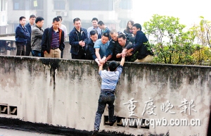 “爸爸,不要跳樓!”昨日上午7時許,渝中區(qū)白象街31號10樓,5歲兒子周周(化名)撕心裂肺的哭聲,刺痛嚴(yán)某的心。“我不跳樓了!眱尚r后,嚴(yán)某嚎啕大哭放棄輕生念頭,雙手抱頭向警方投降自首——此前,他將妻子殺死在租賃房中,隨后上到樓頂決定跳樓輕生。