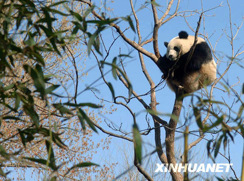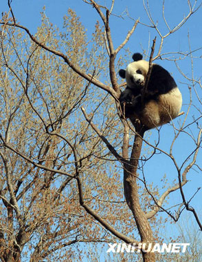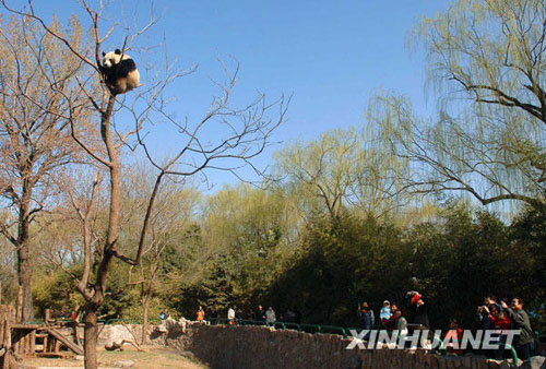 3月22日,北京動(dòng)物園熊貓館的一只熊貓爬到高高的樹上,它憨態(tài)可掬的模樣吸引了很多參觀者駐足觀看。(新華社記者 公磊 攝)