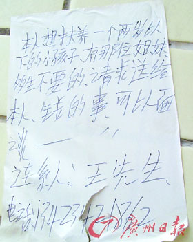 昨日下午,在深圳光明新區(qū)公明辦事處上村社區(qū),記者竟然在一棟樓的墻壁上看見一張買小孩的廣告(見左圖)。這是一張用圓珠筆寫成的廣告,署名為王先生的人稱自己想收養(yǎng)一個兩歲以下的孩子,請有多生孩子的姐妹送給自己一個,價錢可以面談。按照廣告上留的電話,記者撥打過去。接電話的女子稱自己和老公結(jié)婚多年未孕,想收養(yǎng)一個孩子,只好寫了小廣告貼在墻上,希望找到合適的孩子。民政部門的負責人表示,這種街頭廣告收養(yǎng)小孩的方式顯然是不合法的,并提醒市民千萬不要上當受騙。(記者 阮曉光攝)