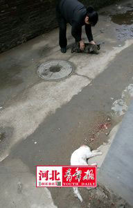 從23日晚上開始,陸續(xù)有石市范東宿舍的居民被橫在一棟單元樓門口的貓尸嚇住,墊著報(bào)紙的貓頭不久也被人們發(fā)現(xiàn)。驚恐之余,居民們?nèi)呵榧崳皻⒇垉词帧币惨l(fā)人們的種種猜想。