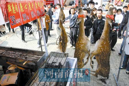 “呀!這是梅花鹿?是保護(hù)動(dòng)物吧?太殘忍了!”圍觀的市民對(duì)攤位里穿著紅肚兜、伴著“舞曲”邊烤邊扭的攤主和他手里的“天價(jià)肉串”并不是很感興趣,而是對(duì)攤位前鐵架上懸掛的三只死去的梅花鹿指指點(diǎn)點(diǎn)。
