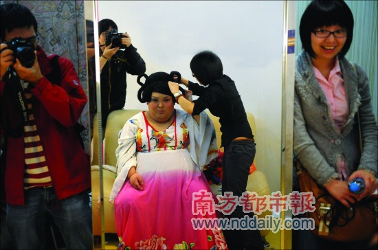光梳妝打扮,林思思花了一個(gè)多小時(shí)。盤(pán)上發(fā)髻,插上金簪,披起拖地長(zhǎng)裙,秋波流轉(zhuǎn),“我漂亮嗎?”沒(méi)人敢否認(rèn),歷練多年后,這個(gè)28歲的重慶小伙反串楊貴妃頗有一手。他卻要折騰,昨日,他來(lái)到深圳和鵬程醫(yī)院一同面對(duì)媒體,宣布將接受整形,今后以“沈殿霞”形象示人。