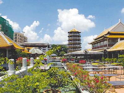 記者遠(yuǎn)遠(yuǎn)就看到了馬路邊上的飯店,就像一片蘇州園林。黃瓦紅柱、亭臺(tái)樓閣、小湖假山,完全是中式風(fēng)格。走進(jìn)大門(mén),先看到一塊牌匾,上面是放大的吉尼斯世界紀(jì)錄證書(shū),這份發(fā)放于1992年的證書(shū)上面記載的是:飯店面積8.35英畝(約合3.38萬(wàn)平方米),員工1200名,可提供5000人同時(shí)就餐。記者在這里完全體會(huì)不出是在外國(guó),吃的是中國(guó)菜,菜單上也有中文。據(jù)介紹,泰國(guó)大部分大型娛樂(lè)設(shè)施都是華人老板,這座“龍城花園酒家”也不例外。