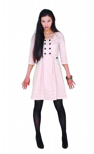 珍珠粉是今年的流行色,非常適合春天這個季節(jié),這件衣服的面料比較厚,又適合在有點涼的時候穿。這個款式簡單又甜美,非常適合OL和具有可愛氣質(zhì)的女性穿著。發(fā)型最好搭配比較自然的披肩發(fā)。