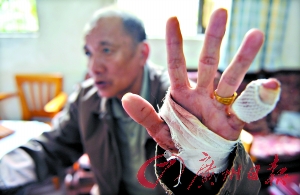 除了手被砍傷以外,洪叔的腰部也被劃傷,走路時一瘸一拐;貞浨巴戆l(fā)生的事情,洪叔和美姨都很后怕。洪叔說,當晚8點50分,美姨到洗手間沖涼,廳里只剩下他一人。十分鐘后,洪叔突然看到兩個身影閃進院內(nèi),還沒有等他反應(yīng)過來,一名男子捂住他的嘴巴,拿著西瓜刀說,“不要動,再動就捅死你!”另外一名男子則在屋內(nèi)到處翻找,洪叔拼命地掙扎反抗。