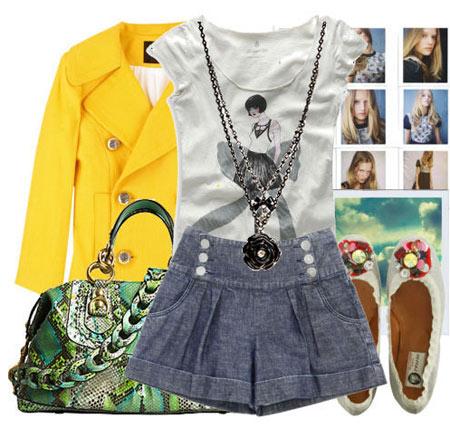 與海軍風(fēng)的高腰牛仔裙褲相搭配,加上香奈兒風(fēng)格的山茶花長項鏈,打造年輕時尚。