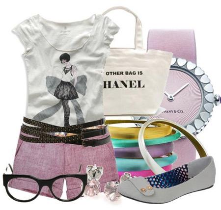 粉色短褲腰間扎上雙層鉚釘皮帶,搖滾風(fēng)格的混搭。