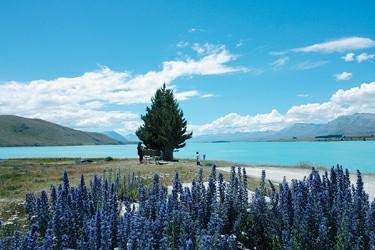 擱下行李我們一直向南而去,尋找皇后鎮(zhèn)南端的人間仙景蒂卡波湖。寂靜的湖面,四周覆蓋著蒼翠的樹木和盛開的魯冰花,加上對岸雪山倒影,四季美景濃縮一簾。缺水的新西蘭島國對湖水的利用可以說是費煞苦心,海拔700多米的高山湖泊,筑了7條人工導(dǎo)流明渠,不但用以截流灌溉,而且,還在每一出水口修建了水利發(fā)電廠,7座電廠為南島的畜牧農(nóng)漁提供了豐裕的清潔能源?蒲腥藛T還在截流湖中試養(yǎng)原本生活在大海里的“三文魚”。第一次見到在淡水中游弋的“三文魚”,怎不叫人嘴饞!花上10個紐幣,我們吃上了活殺生食的淡水“三文魚”。說實話,這人工飼養(yǎng)的淡水“三文魚”太肥太油膩,口感和味道遠差海水“三文魚”一籌,但我還是由衷感到高興,這畢竟是人類由漁到養(yǎng)的轉(zhuǎn)變,“三文魚”將永不枯竭。食罷魚宴,不久,我們的車已駛?cè)肓诵挛魈m著名的南島水果園,紅的櫻桃、粉的水蜜桃、黃的杏子、綠的蛇果,五顏六色的累累碩果,掛得樹條彎下了腰。為了充分利用水資源,每棵樹下均有一條微型水管進行滴灌,晝夜較大的溫差,明媚陽光的輻射和沒有污染的潔凈空氣,給水果提供了優(yōu)良的生長環(huán)境,來到了果園,人人現(xiàn)摘現(xiàn)吃。導(dǎo)游見我從樹上摘下櫻桃還要在自己T恤上蹭蹭,便告訴我說,不用蹭,這里的水果很干凈。于是,我扔幾粒入口,原汁原味。