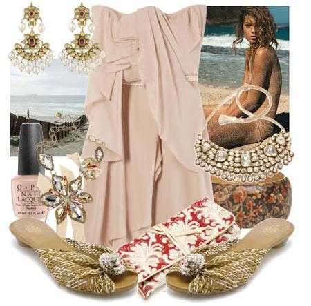 柔粉色抹胸小禮服裙,皺褶的荷葉邊甜美可愛,適合海邊的Party。