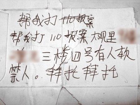 “幫我打110報(bào)案……有人軟禁人,拜托拜托!弊蛉障挛2點(diǎn),家住成都大觀里某小區(qū)的一位大爺正在小區(qū)內(nèi)散步,突然,一張硬紙條歪歪扭扭地從三樓窗戶飄落下來,大爺拾起一看,大吃一驚,立即將紙條交給小區(qū)門衛(wèi)。5名警察接警后立即出動……