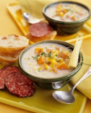 湯類非常有益健康,而且價格低廉、易于制作?墒牵扪b濃湯是由鹽、脂肪、人造添加劑、防腐劑,或許還有一些脫水胡蘿卜調(diào)制成的營養(yǎng)價值非常低的“混合物”。一罐濃湯含1000毫克鈉,大約是你每天所需量的一半。因此,還是自己準(zhǔn)備雞肉、牛骨和蔬菜,親手做一碗熱騰騰、香噴噴的湯吧。