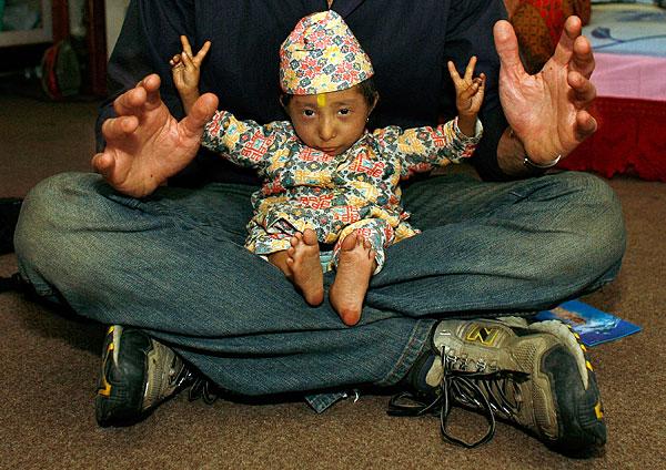 到2009年10月份年滿18歲時,現(xiàn)身高51厘米、體重4.5公斤的尼泊爾人卡根德拉·塔巴·馬加爾(Khagendra Thapa Magar)或?qū)⒊蔀榧崴故澜缂o錄里最矮的人。
