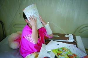 丹丹見到鏡頭馬上用書將臉遮擋起來。5歲女童丹丹被確診為急性重型再生障礙性貧血,入住北京道培醫(yī)院準備骨髓移植。到昨日為止,她的父母已經(jīng)“消失”9天了。本報記者 吳江 攝