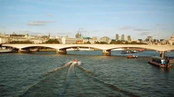新的滑鐵盧橋?yàn)殇摻罨炷两Y(jié)構(gòu),遠(yuǎn)遠(yuǎn)望去,外形簡單卻不失典雅。橋下5孔有如五道彩虹首尾相連,橫跨泰晤士河南北兩側(cè)。由于此處位于倫敦鬧市區(qū)中心地帶,而泰晤士河恰好又在此轉(zhuǎn)了一個(gè)近乎90度的大彎,因此觀賞起兩岸的綺麗風(fēng)光,可以說視角最佳、景致最好。