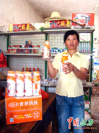當(dāng)日上午,記者驅(qū)車來到墩上村實(shí)地采訪。今年41歲的鄒根枝兒女都在外務(wù)工,和丈夫鄒新海兩人在家?guī)腿搜b殼子板,每天120多元的收入讓兩人很是滿足,平時除了吃飯外還特意買些原料補(bǔ)充營養(yǎng)。鄒根枝介紹說:“6月20日,我從墩上村鄒德水的便利店里買來一箱娃哈哈營養(yǎng)快線,當(dāng)時怕飲料不新鮮,還特意看了生產(chǎn)日期,見是2009年5月31日生產(chǎn)的才放心買了回去,放在家里晚上看電視的時候喝,有些時候我老公(鄒新海)也喝一瓶,但沒有我喝得多。幾天后,我感覺肚子不舒服,上吐下瀉,為此專程搭車到萬年縣石鎮(zhèn)街去買胃藥,花了差不多200元錢病情卻不見好轉(zhuǎn),而且肚子痛得特別厲害。沒有辦法,我只好到屋前的墩上衛(wèi)生所去看病,打了幾天吊針以后病情才有所好轉(zhuǎn)。這次看病不僅花費(fèi)了近400元醫(yī)藥費(fèi),還耽誤了一個多星期沒有干活,就連前兩天插秧都是請人干得,我的損失可大了!