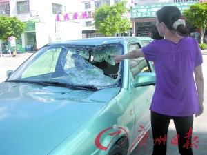 前日晚上11時,記者接報趕到清溪鎮(zhèn)廈坭市場的附近,記者看到,一輛綠色小轎車的擋風(fēng)玻璃被砸了一個大窟窿,車頭也有輕微凹陷,一縷暗紅的血跡仍清晰可見。