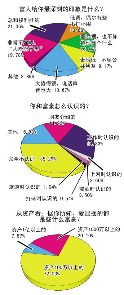 認(rèn)為“現(xiàn)在的富豪很低調(diào)”、“大隱隱于市”、“發(fā)家清白”的網(wǎng)友,比認(rèn)為“富豪一副勢(shì)力相,嗓門比常人高八度”的網(wǎng)友多兩個(gè)百分點(diǎn)。但在“和富豪是怎么認(rèn)識(shí)的”這一項(xiàng)調(diào)查中,有25%的網(wǎng)友稱自己在工作中結(jié)識(shí)過富豪。