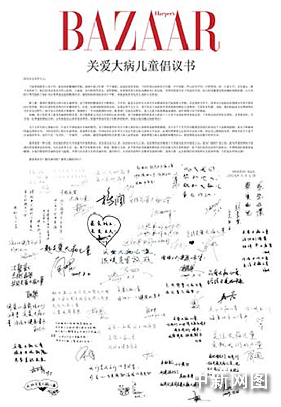 中新網8月10日電 今日,時尚雜志《時尚芭莎》攜手百位明星、名流和企業(yè)家發(fā)起聯(lián)名倡議,呼吁政府相關部門、各級慈善公益組織,共同關注中國大病兒童這一弱勢群體的生存、救助問題。同時,《時尚芭莎》宣布將于9月底在京舉行,本屆活動募集的所有善款都將全部捐助給國內大病兒童救助公益事業(yè),以此慈善盛舉向偉大祖國六十華誕獻禮。