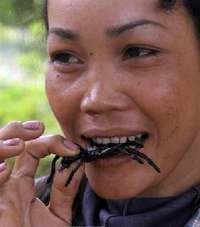 柬埔寨有種獨特的食物——油炸毒蜘蛛。這種蜘蛛主要產(chǎn)于中部的磅通省,以其肥碩、美味而著名。其他省份也有出產(chǎn),但比磅通的略遜一籌。毒蜘蛛不像我們常見的蜘蛛凌空結(jié)網(wǎng)而居,而是生長在地下,挖穴棲身,以吃草根果腹,抓它們要掘地三尺。每年4月中旬是毒蜘蛛最多最肥的時候,捕食蜘蛛當以此時為佳。